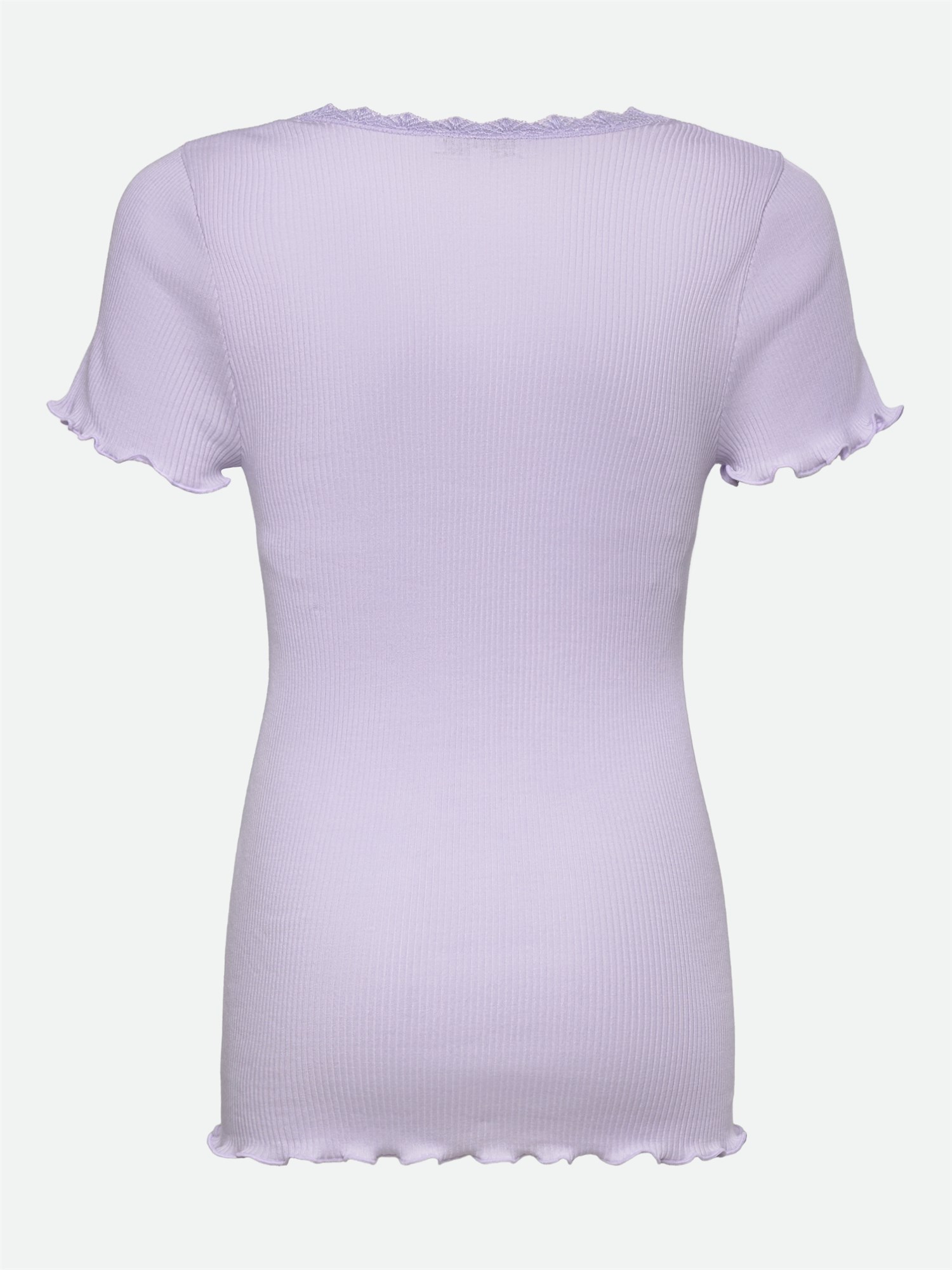 Langærmet bluse med rund hals. Blusen har en fin tynd blondekant rundt i halsen og har krølkant nederst og på ærmerne.