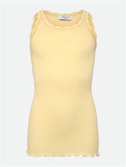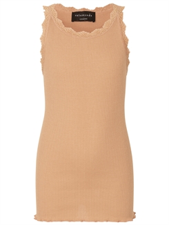 Sød blondetop perfekt til en pige. Blondetoppen er rundstikket i et blødt silkemix med en blanding af bomuld og silke, hvilket gør den behagelig at have på, selv for et aktivt barn. Blondetoppen er designet med en smuk krølkant forneden og en klassisk blonde omkring en rund halsudskæring, der fuldender det smukke look. Den klassiske blondetop har fået lidt ekstra længde på, for at gøre den mere anvendelig. Blondetoppen er uden ærmer og har ingen syninger, hvilket gør den behagelig at have på både alene som en basis top eller under en fin kjole eller strik. Blondetoppen er den perfekte essential til en piges klædeskab, da den kan bruges året rundt.